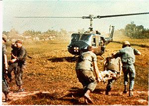 This Dustoff mission occurred in 1967 near Dak To. Often the Dustoff pilots weren’t able to land, but hovered over rough terrain while the wounded where loaded aboard.