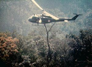 This photo and the next one were taken from a Chinook while an Eagle Dustoff ship performed a rescue mission over terrain that would not allow landing.