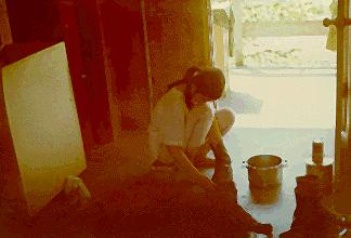 One of our hooch maids at Binh Thuy, known to us as “My Little Chicadee”, putting a spit shine on some of our boots.
