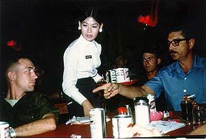 Relaxing during off-duty hours at the Officer’s Club, from left to right – Gary Chester (Dustoff pilot), Mary Atkinson (Donut Dolly), and David Freeman (Dustoff Pilot)